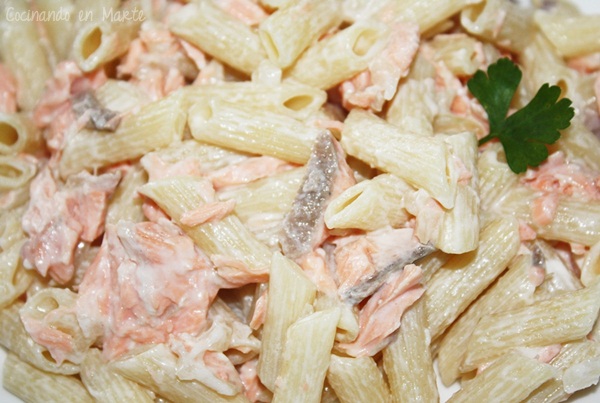 Raro es a quien no le guste la pasta, al menos nosotros no conocemos a nadie que no la coma a gusto, sobre todo si está bien acompañada. Esta vez, para cambiar de cómo la comemos de normal, o bien tipo boloñesa o con atún en lata, nos apetecía probar con otro pescado. El salmón, que nos encanta a los dos, es bastante sano por todos los ácidos grasos omega 3, así que junto a la pasta nos pareció una opción estupenda.